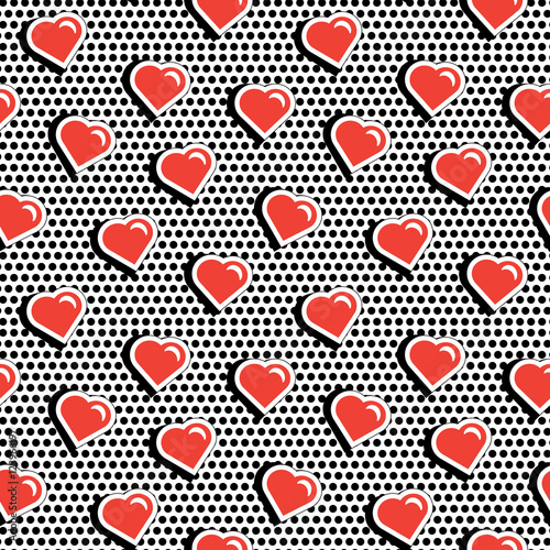 Seamless Pattern With Colorful Badge Shape Hearts On Black Dotty Background Vector Illustration With Heart Stickers In Cartoon 80s 90s Comic Style Pop Art Stile Repeating Texture With Red Hearts Wall Mural Vector background background creative heart valentine.
