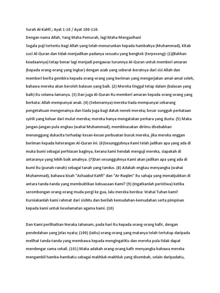 Alkahfi 1-10 100-110 : Surah ini terdiri atas 110 ayat dan bercerita tentang beberapa orang pemuda yang tidur dalam gua.