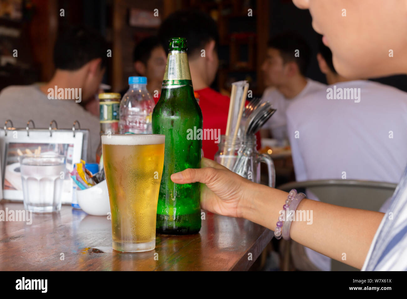 Female Hand Holding Bottle Of Beer On Table In Reataurant Stock Photo Alamy King fisher company introducing new instant beer 🍺 with very small instant pack.