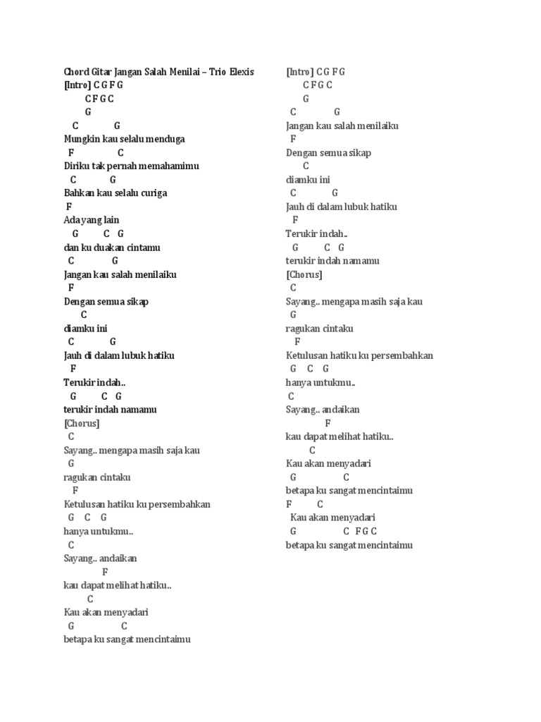 Lirik Dan Chord Lagu Jangan Salah Menilaiku Trio Elexis verse: c# g# jangan kau salah menilaiku f# c# dengan semua sikap diamku ini c# g# jauh di dalam lubuk hatiku f# terukir indah.
