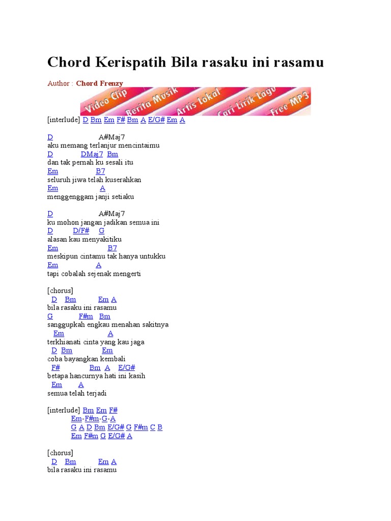 Catatan Not Lagu Kerispatih Bila Rasaku Ini Rasamu Piano Pemula Lhia S Music Notes D bm em a bila rasaku ini rasamu g f#m bm sanggupkah engkau menahan sakitnya em a terkhianati cinta yang kau jaga d bm em coba bayangkan kembali f# bm a e/g# betapa hancurnya hati ini kasih em a semua telah terjadi.