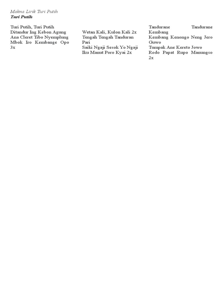 Lirik Lagu Turi Turi Putih Ditandur Ning Kebon Agung : Anda tak mengetahui judul lagu, tapi mengetahui nama penyanyi.