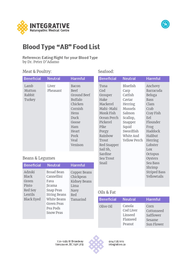 18 05 03 Integrative Handout Blood Type Ab Food List Pdf Breads Pasta The blood type diet made popular by dr.